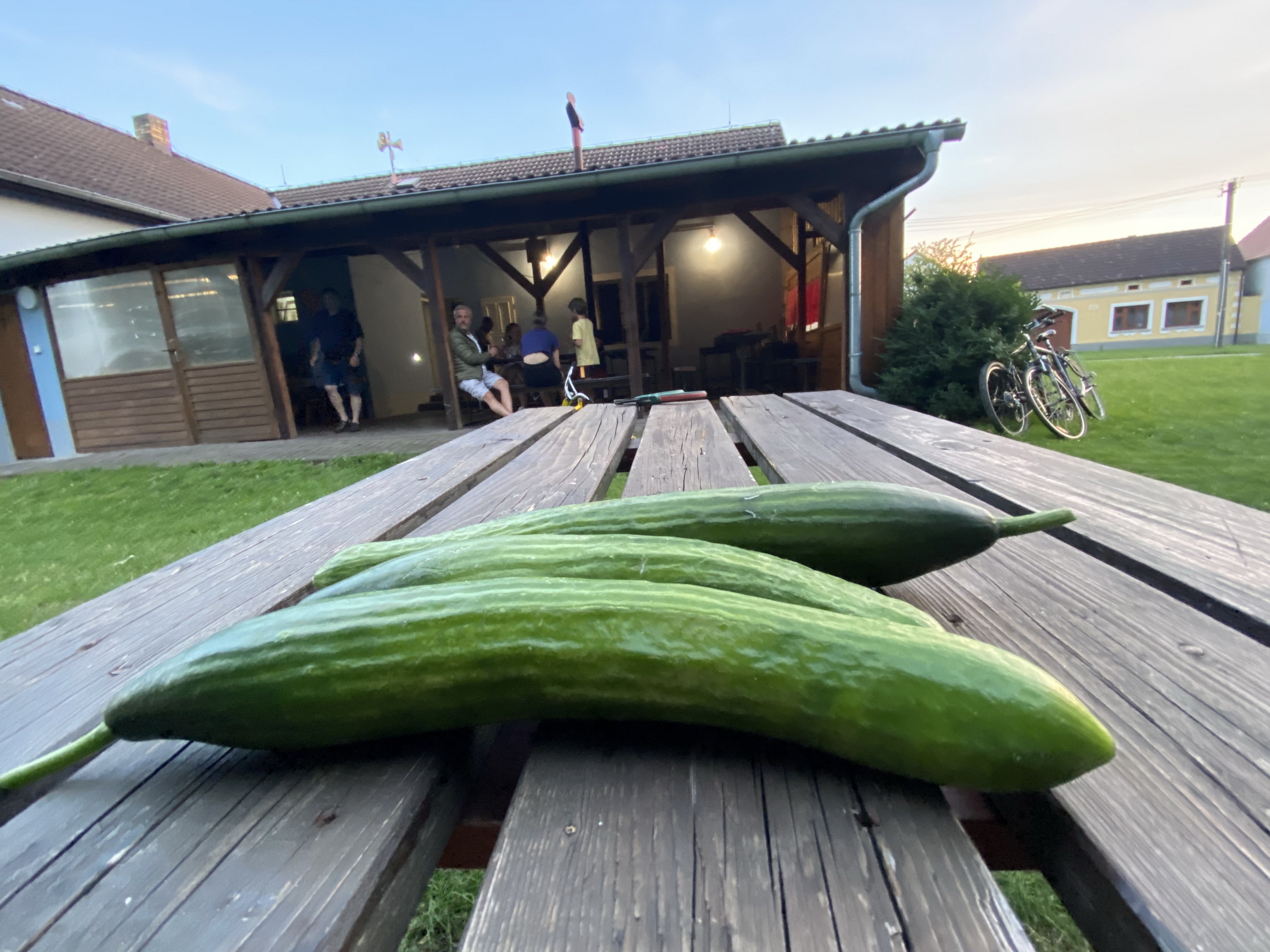 Jak koukáme tím směrem, před námi na stole leží tři obří okurky. To už ale prochází další Aboriginec a řka „ty vám tu nenechám, ty si beru“ se zlomyslně uchechtne, zmocňuje se jich a mizí směrem k chalupě.