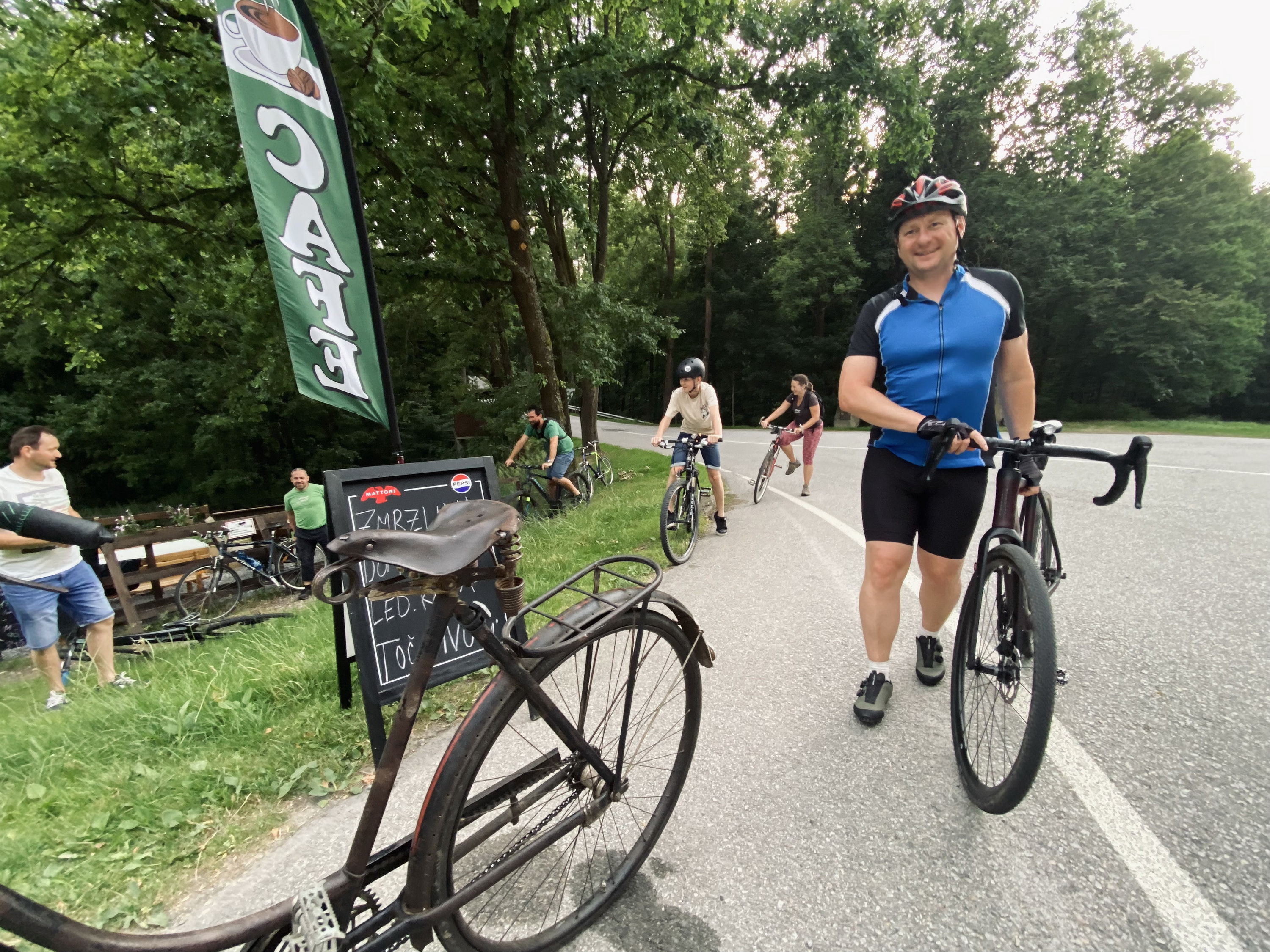 Vzhledem k tomu, že jsme měli časovou sekeru větší než průměrný dřevorubec, vzali jsme to „zkratkou“ přes Bohunice. Strategie jasná: je to sice dál, ale zato do kopce. Klimas vytáhl ze stodoly historický skvost jménem KLENOT. Romantika v sedle, Zlatá hodinka v zádech, vrzání řetězu jako doprovodný orchestr. Ostatním to trošku vadilo a tak jej nechali jet dostatečně vpředu, aby si myslel, že je chvilkama rychlej. Elvis naopak vsadil na technologickou dominanci a provětral svůj nový, vyvoněný karbonový štěrkolet. Patrně proto, aby nás v cíli mohl dostatečně dlouho vyhlížet.