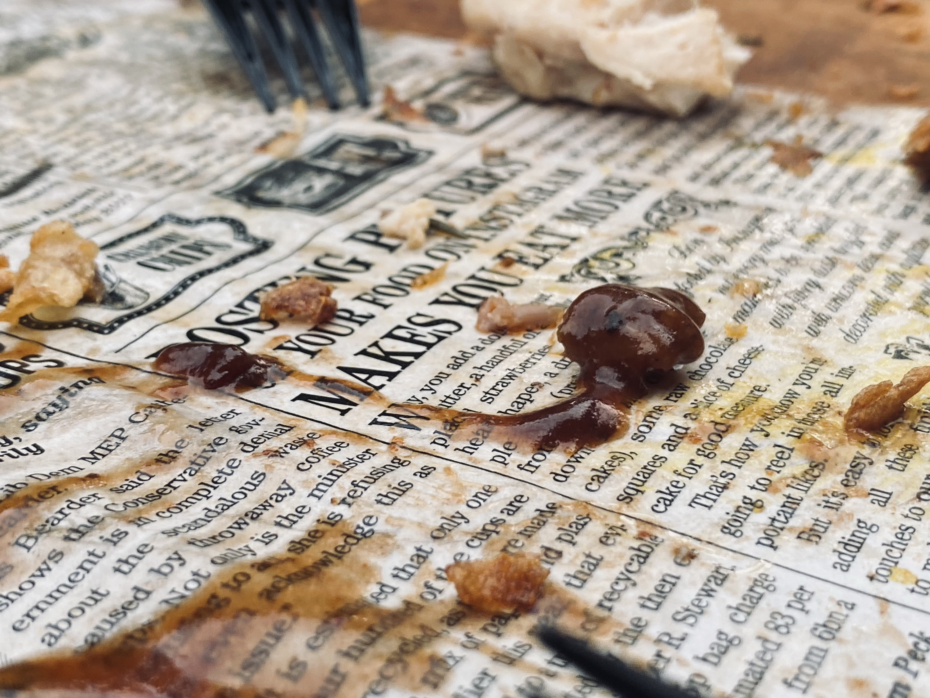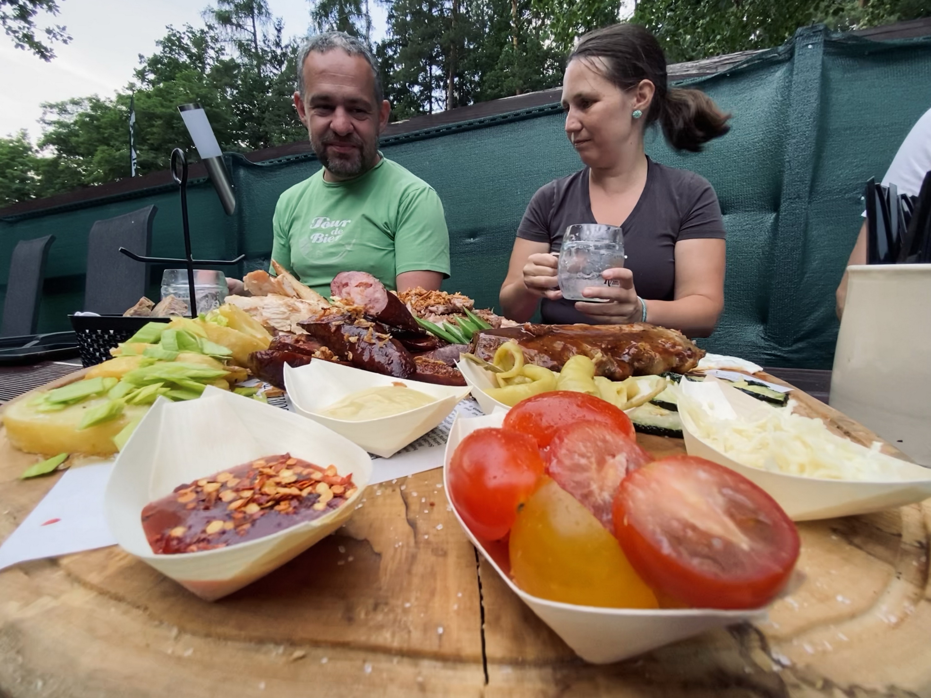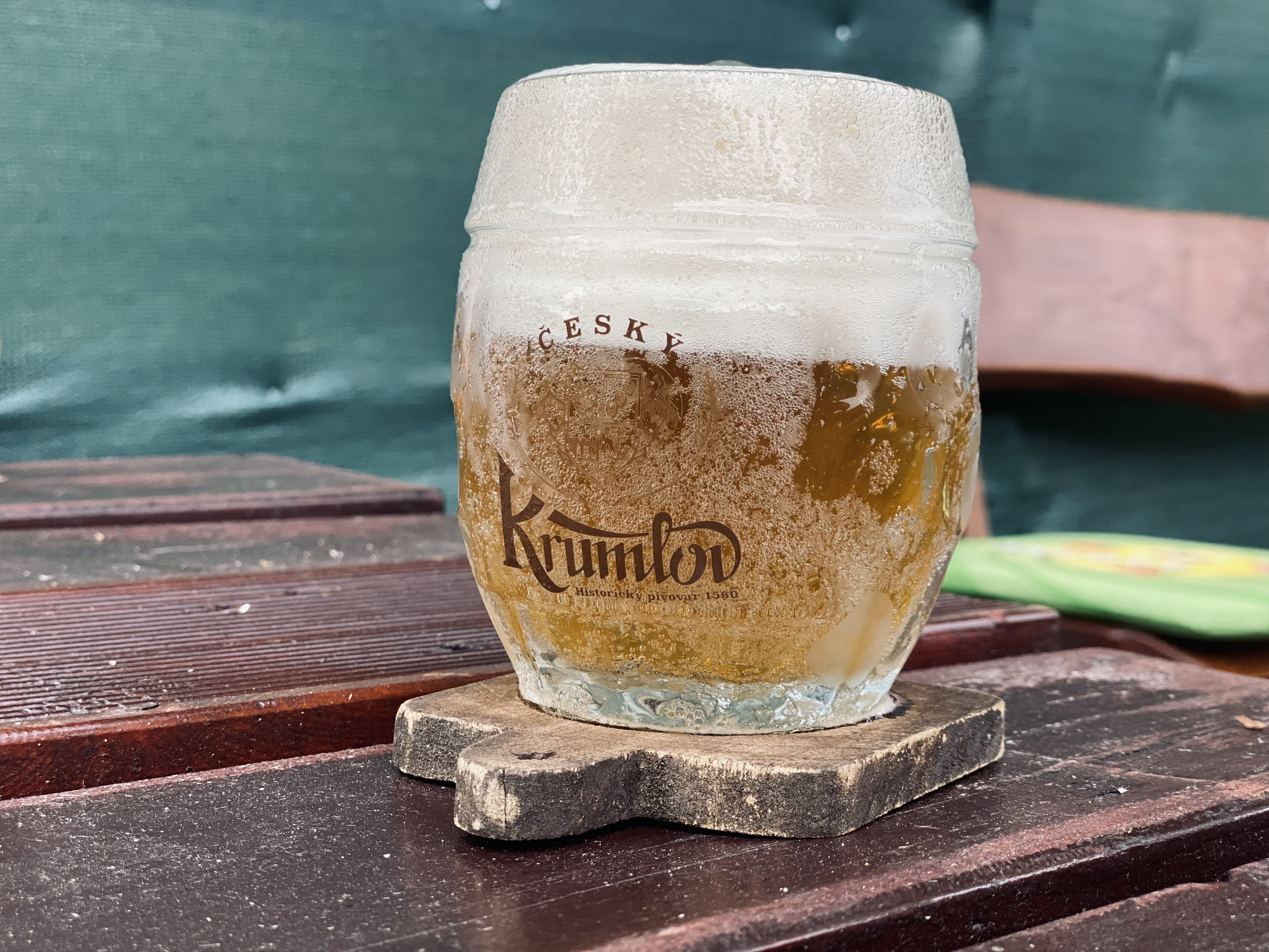Pivo: Krumlov 11°. Tady přichází první zdvižený prst komise. Sklenice byly tak špinavé, že bublinky na skle tvořily mapy připomínající dusíkovou narkózu potápěče v amoku. Čest zachraňovalo aspoň poctivé namražení skla a stylové podtácky ve tvaru prkýnek. Malý plusový bodík za snahu, ale příště prosím houbičku do ruky! Je to škoda, takhle zbytečně si pokazit skvělý dojem.