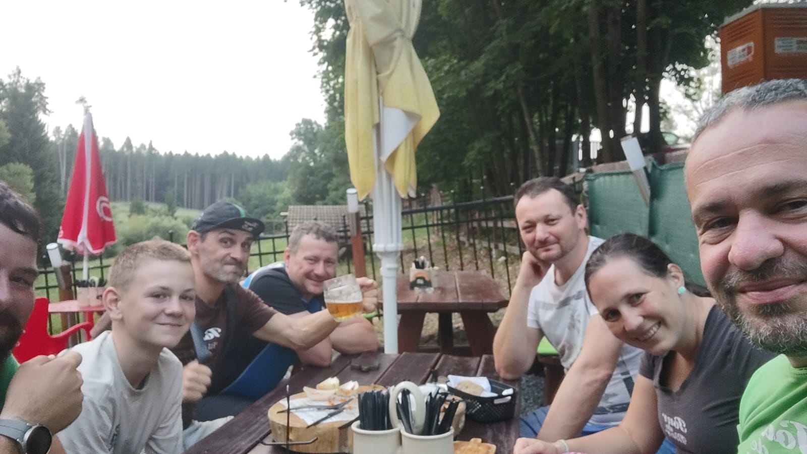 Hugo tentokrát prokázal neuvěřitelný talent a prorazil přední duši už po pár desítkách metrů u tiskárny. Místo opravy zvolil potupnou cestu domů pro náhradní stroj, zatímco my jsme v komisi pilně ladili pitný režim. Standa vydá minimálně za dva – jak v kopci, tak u pípy. Tak se nás s těmito počty nakonec sešlo osm! Číslo, které jsme v análech TdB neviděli celá staletí. Osmička statečných.