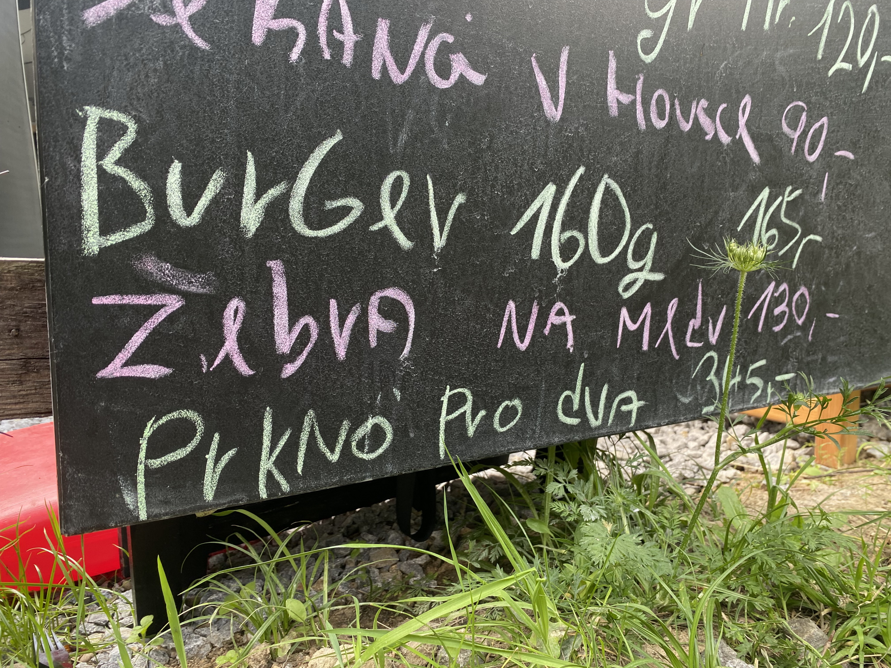 Už z dálky (tedy mě až zblízka, neboť mi věkem slábnou senzory) nás vítá křídová tabule slibující věci nevídané: Krkavice na prkně a Zebra na medu.